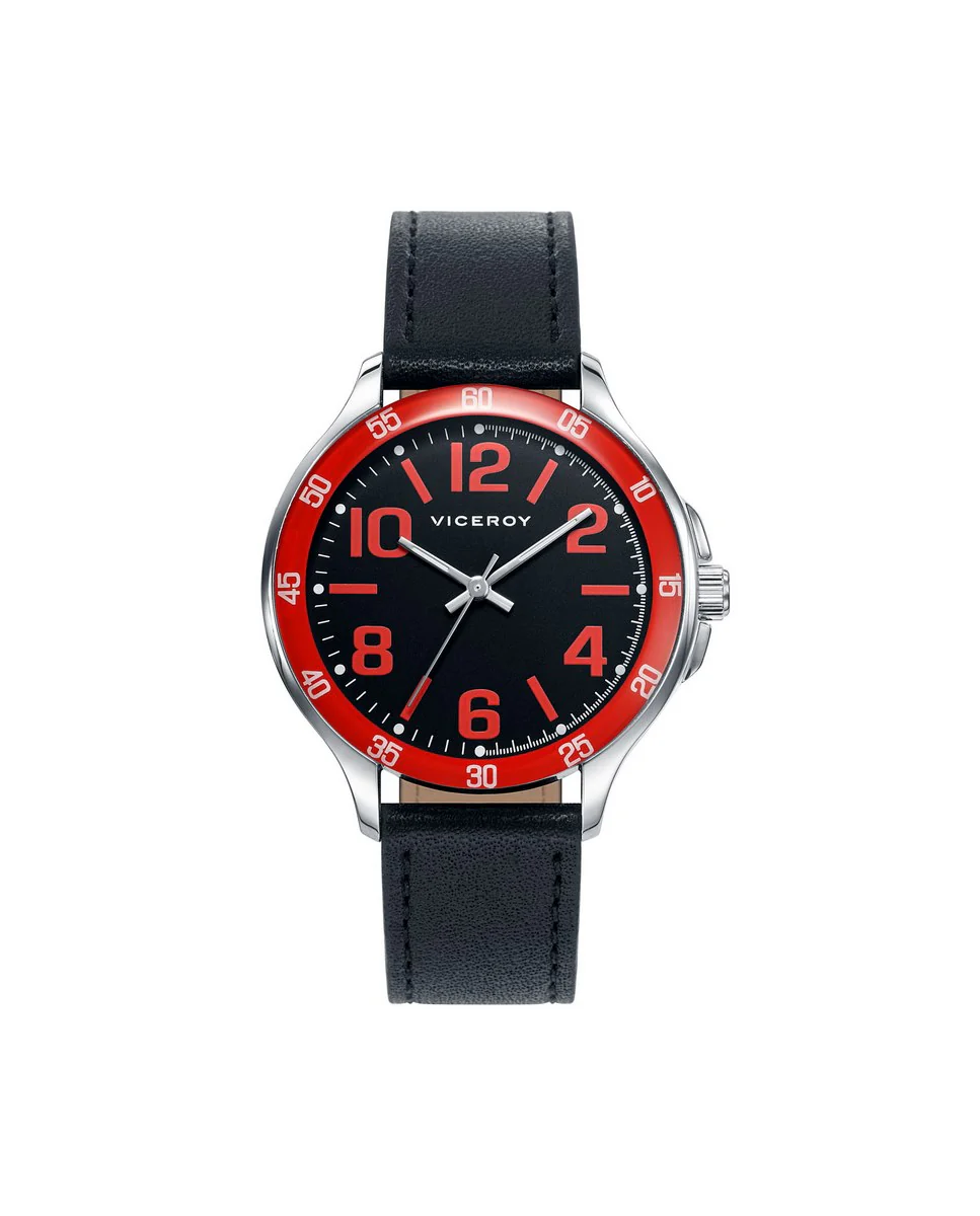 Conjunto de niño Viceroy de reloj con esfera negra con detalles y bisel rojo, números árabes y correa de piel negra. El conjunto lo completa una pulsera de cuero trenzado negro.