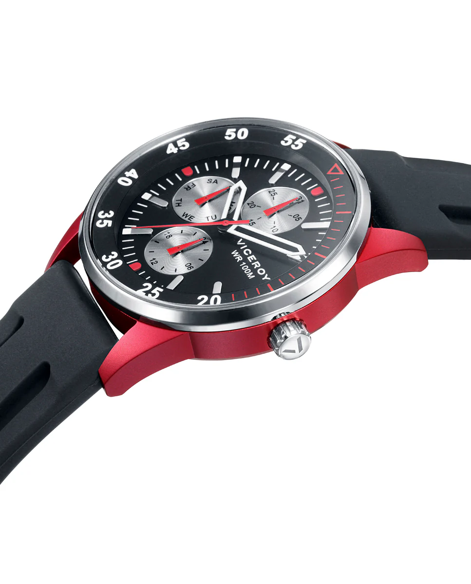 Reloj de Niño Viceroy Next multifunción, caja de aluminio rojo y esfera negra. Contadores en plateado, segunderos en rojo y correa de silicona negra.